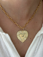 Your choice of engraving on our classic Gracie Heart, gold finished paired on our antiqued gold link chain, 17in